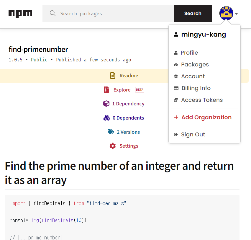 배포가 완료되면 npm사이트의 packages에 패키지가 나타납니다.